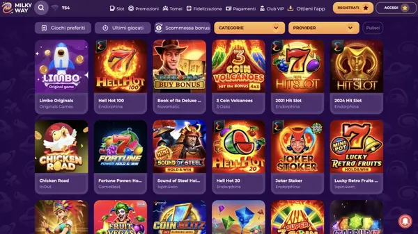 La nostra sezione slot è pensata per la varietà , dai layout classici con linee di pagamento semplici alle moderne video slot con giri bonus, simboli espandenti e feature buy dove disponibile. Nella lobby puoi filtrare per provider, stile di volatilità e temi, il che ti aiuta a trovare giochi adatti al tuo bankroll e al tuo ritmo. Se cerchi slot MilkyWay, vedrai un’ampia selezione di studi come Pragmatic Play, NetEnt, Nolimit City, Microgaming e Yggdrasil Gaming. Ospitiamo anche giochi jackpot e di tipo progressivo, dove il montepremi può crescere in base al gioco, e le regole sono mostrate nella tabella pagamenti di ciascun gioco.