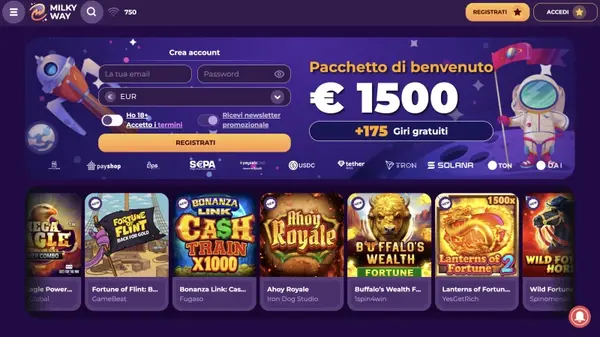 Abbiamo costruito la nostra offerta per gli utenti italiani che vogliono flessibilità : giocatori occasionali che preferiscono piccoli depositi, giocatori esperti che cercano molti provider e utenti crypto che desiderano pagamenti più rapidi. Se stai cercando informazioni su casino MilkyWay Italia, questa pagina spiega come lavoriamo in EUR, quali documenti potremmo richiedere e cosa aspettarti prima di piazzare la tua prima puntata. MilkyWay supporta anche l’italiano insieme a molte altre lingue, aiutandoti a navigare comodamente tra impostazioni dell’account e promozioni.