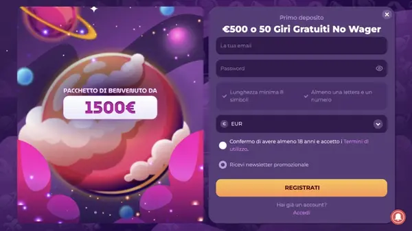 Per creare il tuo account su MilkyWay, apri il nostro sito web e seleziona il pulsante di registrazione nella parte alta della pagina. Ti verranno richiesti dati di base usati per la sicurezza dell’account e i pagamenti, come l’email e le informazioni personali necessarie per un conto di gioco. Dopo aver inviato il modulo, segui il flusso di conferma mostrato sullo schermo, che può includere passaggi di verifica via email e telefono. Una volta creato il profilo, puoi aprire la cassa per effettuare il primo deposito in EUR e richiedere l’offerta di benvenuto che corrisponde al numero del tuo deposito.