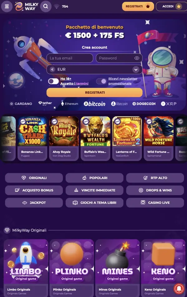 Il nostro obiettivo è far sì che il gioco da telefono sia completo, non limitato. Con MilkyWay Casino, puoi aprire la lobby dal browser mobile e accedere alle stesse principali categorie di giochi che offriamo su desktop, incluse slot, roulette, blackjack, giochi live e titoli jackpot. Supportiamo anche conti in EUR per l’Italia, oltre a depositi istantanei tramite metodi chiave, così puoi iniziare in pochi minuti senza cambiare le tue abitudini.